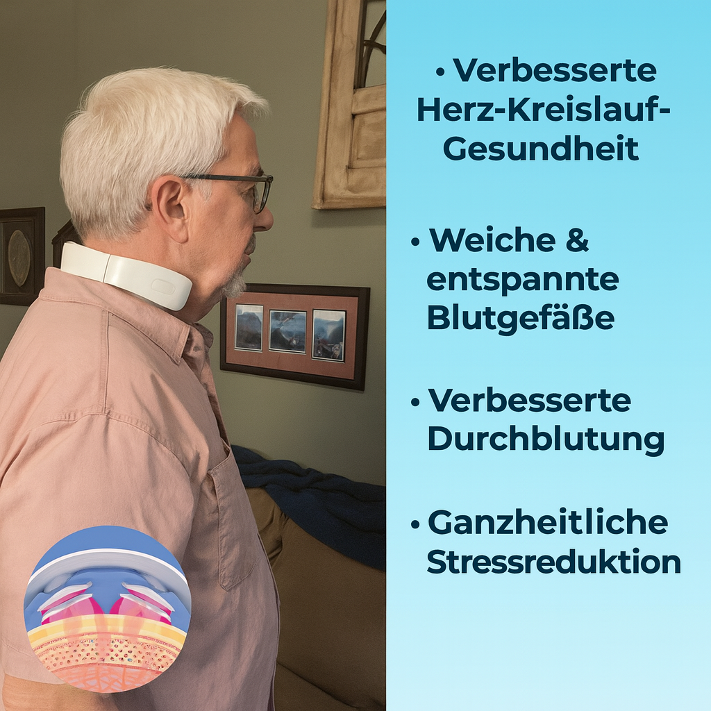 Es funktioniert mittels Dual Pulse Therapy (DPT) – einer wissenschaftlich fundierten Methode, die mit niederfrequenten elektrischen Impulsen sanft die Nerven und Blutgefäße im Nacken stimuliert. Diese Signale helfen, verspannte Muskeln zu entspannen, steife Blutgefäße zu lockern, die Durchblutung zu verbessern und auf natürliche Weise den Blutdruck zu senken.
